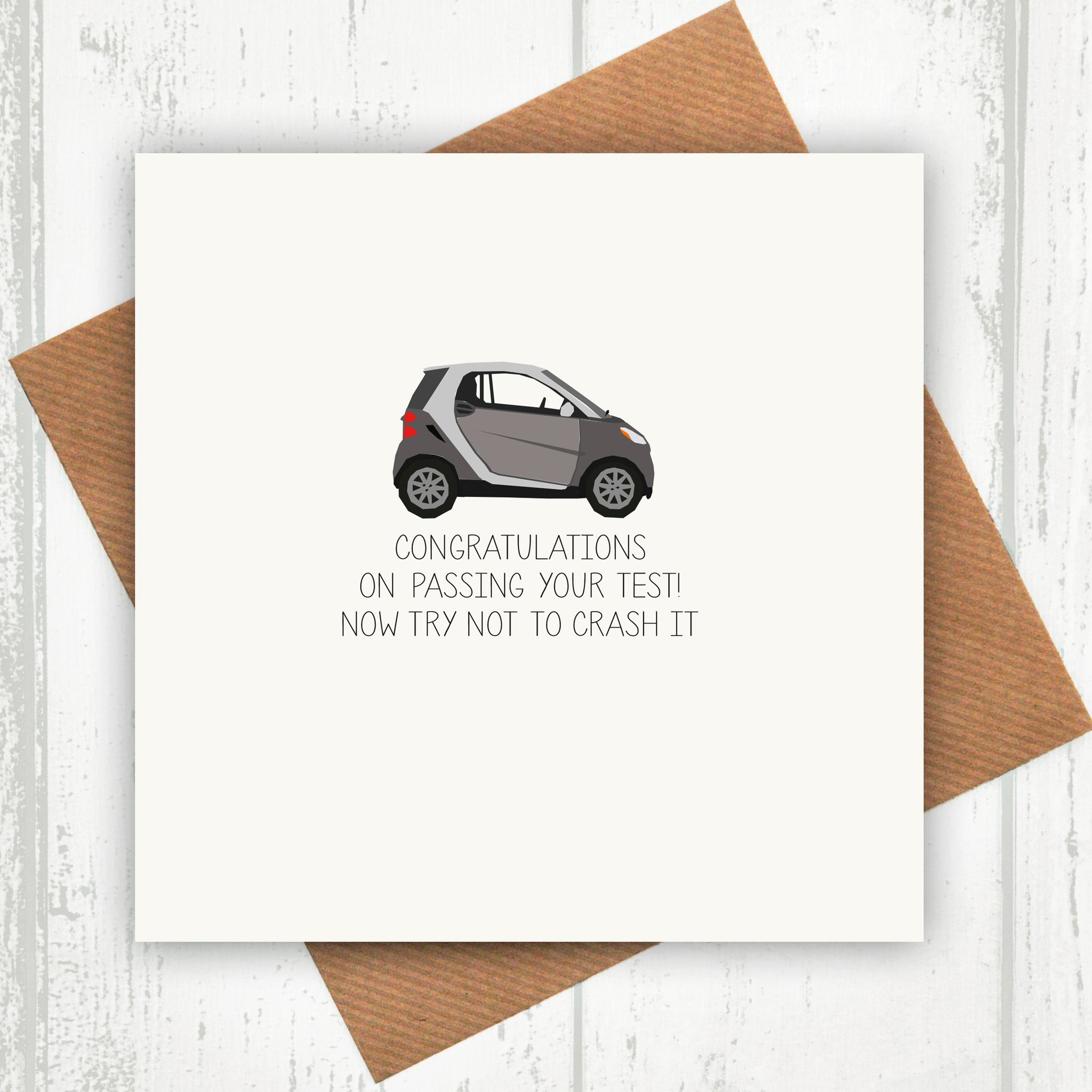 Printed on premium quality, FSC-certified 350gsm thick card, the design features a graphic of a cars, with the caption 'Congratulations On Passing Your Test. Now Try Not To Crash It!'.