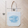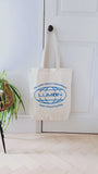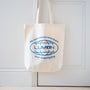Blue vinyl on canvas tote, hand pressed in our Rutland, UK, studio.