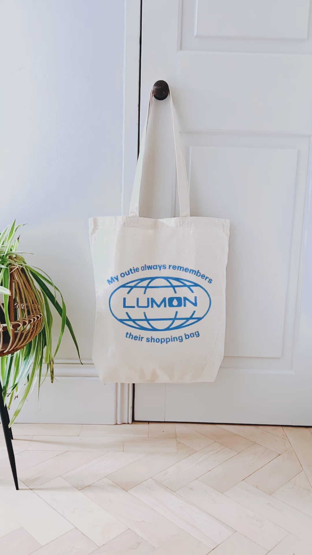 This natural canvas bag features the iconic Lumon Industries logo and the wording 'Please try to enjoy each fact equally'.