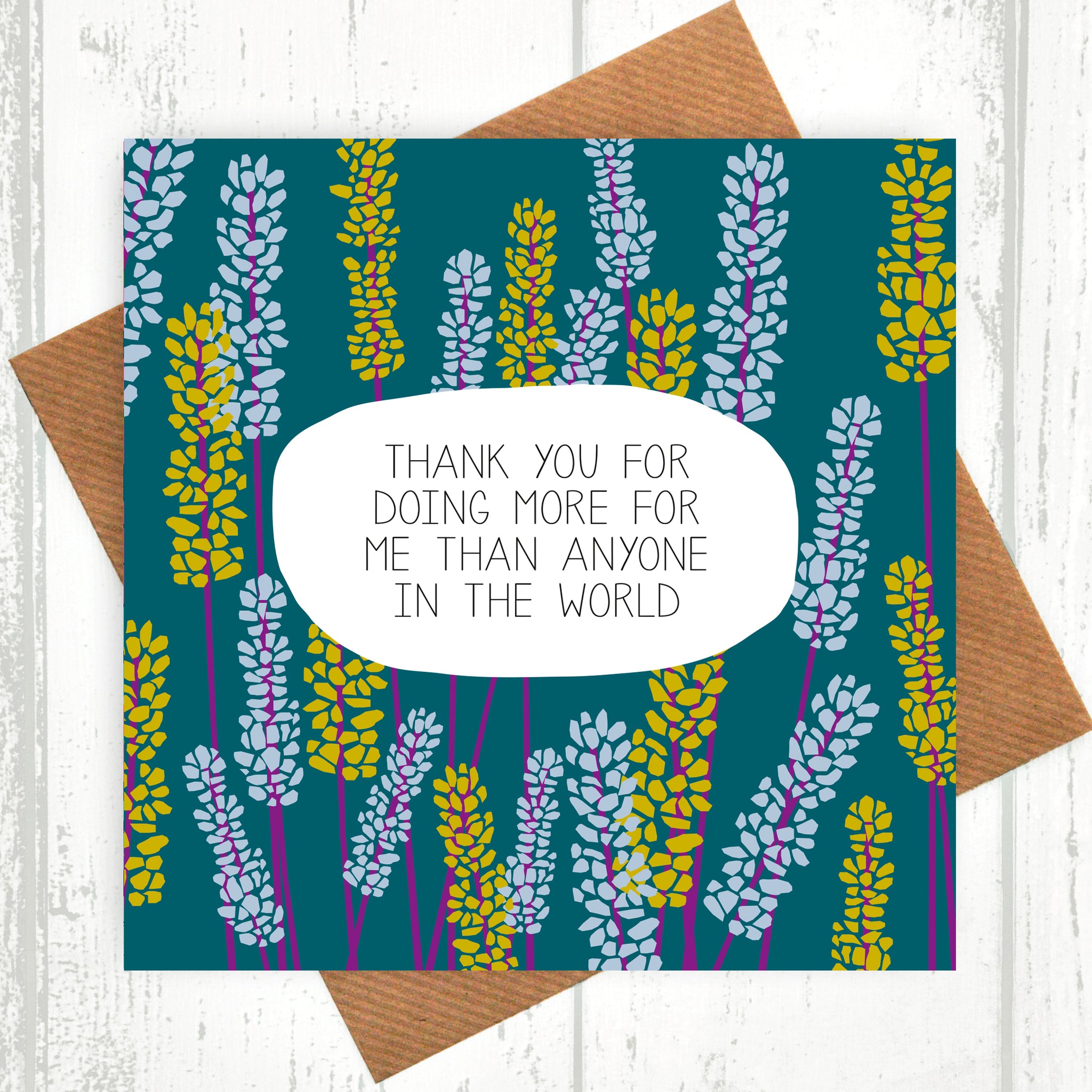 Printed on premium quality, FSC-certified 350gsm thick card, the design features a floral background with the wording 'Thank You For Doing More For Me Than Anyone Else In The World'.