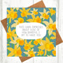Printed on premium quality, FSC-certified 350gsm thick card, the design features graphic daffodil flowers on a duck egg blue backdrop, with the caption 'This Card Expresses About 0.01% Of How Grateful I Am To Have You'.