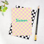 A fun checkerboard 16th birthday card with the word 'Sixteen' on the front.