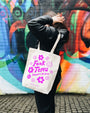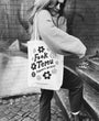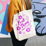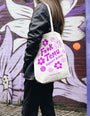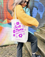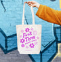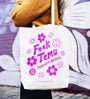 This natural canvas bag features the words F**K Temu. Support Artists in purple vinyl.
