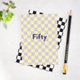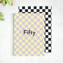 A bright checkerboard 50th birthday card with the word 'Fifty' on the front.