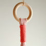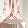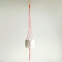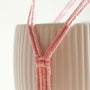 A fun and stylish light blush pink macrame plant hanger with contrasting bright pink detail and wooden hanging hoop.