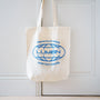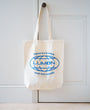 Blue vinyl on canvas tote, hand pressed in our Rutland, UK, studio.